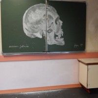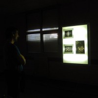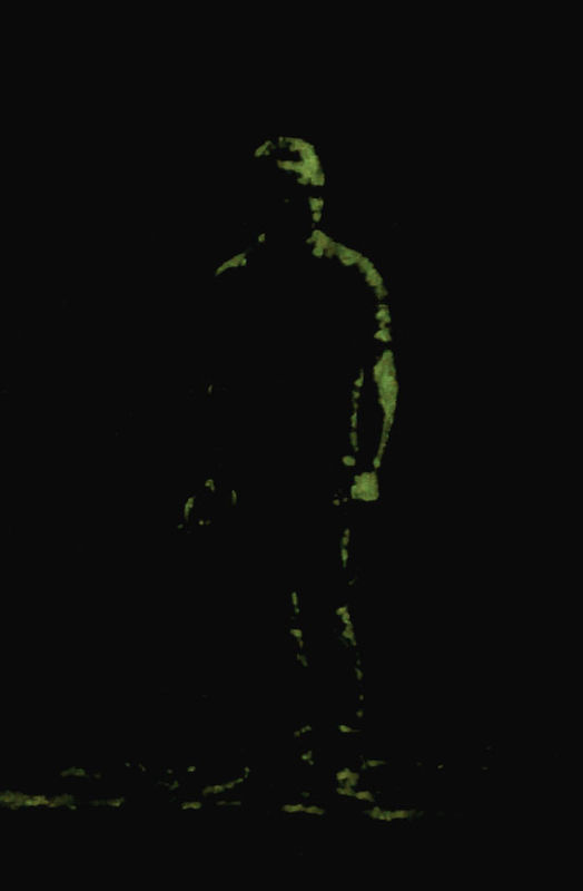 Installation: peinture phosphorescente sur un mur d’une salle d’expo, visible uniquement en éteignant la lumière de la pièce ce à quoi le public était invité après avoir lu une petite pancarte juste à côté de la présence invisible.