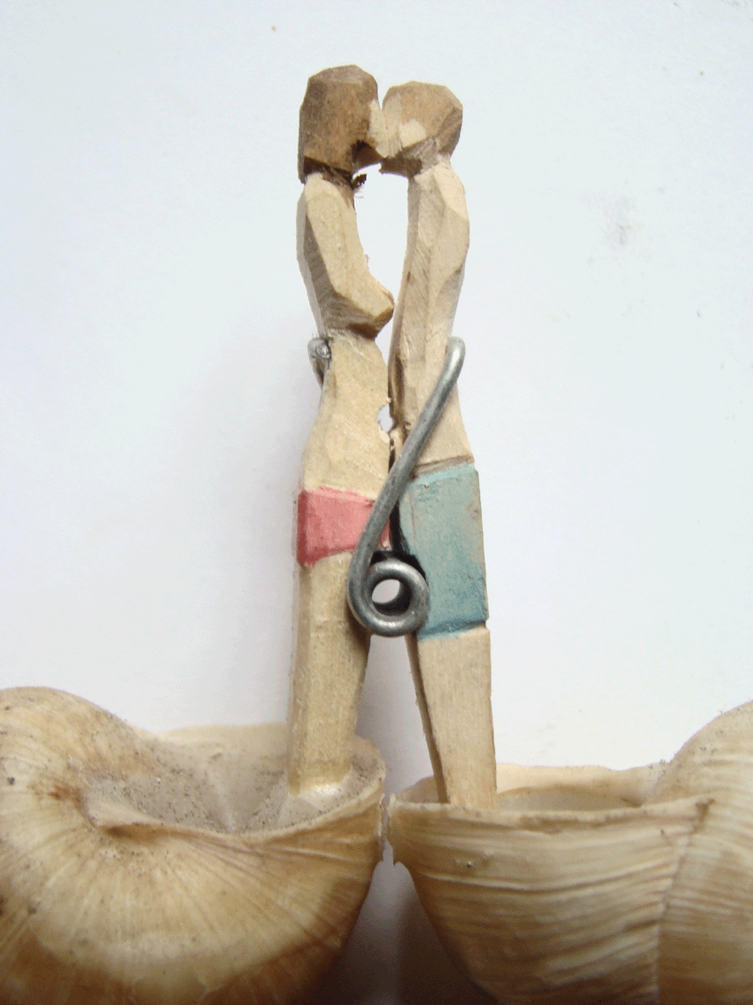 Petites pinces à linge en bois sculptées et peintes. Une idée de 2003, toujours d’actualité.